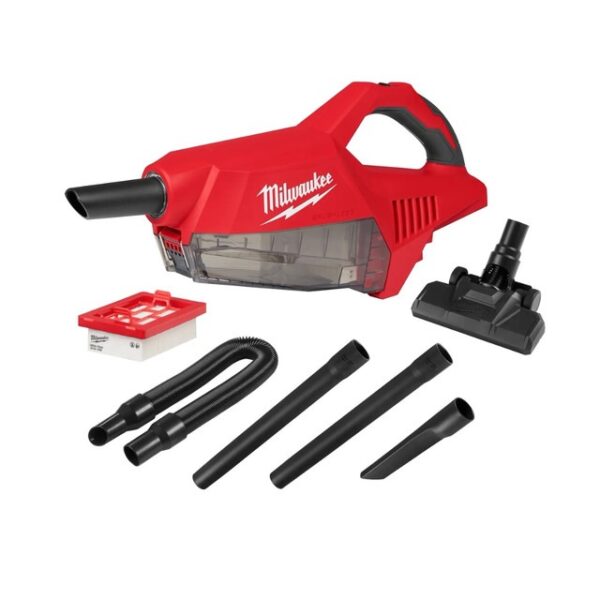 Sản phẩm bao gồm thân máy hút bụi M18 Brushless Handheld Vacuum, bộ lọc HEPA, ống mềm linh hoạt, 2 ống nối dài, đầu hút khe và đầu hút sàn xoay.